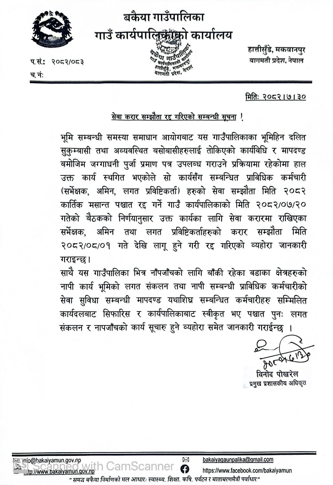 बकैया गाउँपालिकाले करार कर्मचारीको सेवा सम्झौता रद्द गरेको सूचना