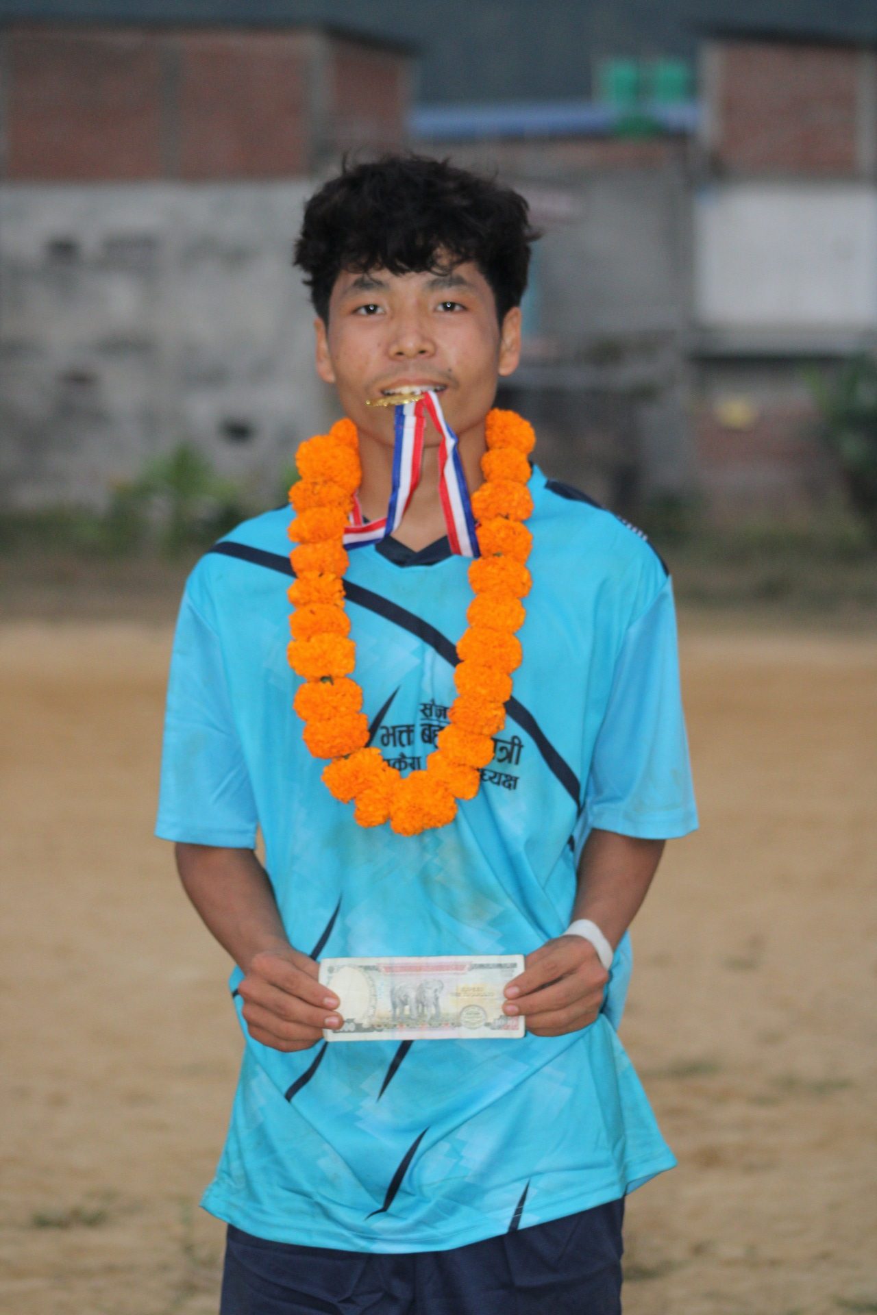 आजको खेलमा उत्कृष्ट प्रदर्शन गर्ने म्यान अफ दि म्याचको अवार्ड हातेमालो क्लब (B)का छेवाङ लामालाई प्रदान गरिएको छ।