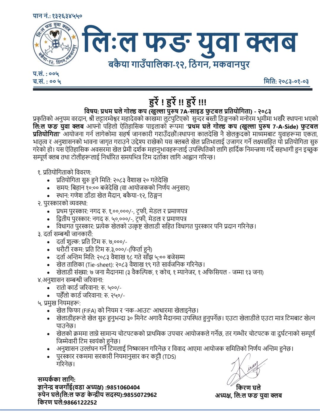 मकवानपुर बकैया – मकवानपुरको बकैया गाउँपालिका–१२, ठिंगनमा रहेको लि:ल फङ युवा क्लबले पहिलो पटक “प्रथम घले गोल्ड कप (खुल्ला पुरुष 7-A-Side) फुटबल प्रतियोगिता–२०८३” आयोजना गर्ने भएको छ।