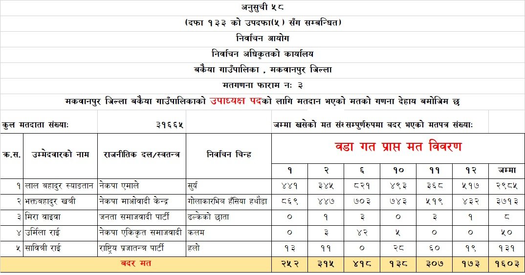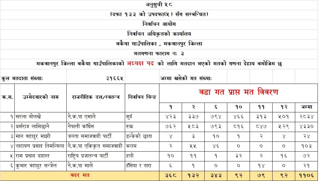 बकैयाका १, २, ६, १०, ११ र १२ को मत परिणाम सार्वजनिक हुदाँ गठबन्धनका अध्यक्ष पदका उम्मेदवार धर्म लामिछानेले ४३३० प्राप्त गर्दा नेकपा एमालेका अध्यक्ष पदका उम्मेदवार सरला बोलखेले २८३४ मत सहित पछ्याईरहेकी छिन् ।